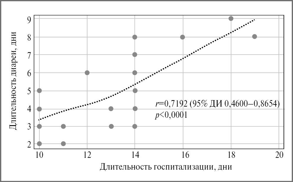 В общем пуле пациентов за период наблюдения диарея зарегистрирована у 21,7% госпитализированных больных (95% ДИ 14,2–29,1) со средней продолжительностью 4,6154 дня (95% ДИ 3,7910–5,4398). На момент госпитализации данный симптом наблюдался у 7,5% пациентов (95% ДИ 2,7–12,2). Токсигенная активность C. difficile зарегистрирована у 6 пациентов, которым дополнительно назначена специфическая терапия без исключения из протокола исследования. Длительность госпитализации в общем пуле пациентов составила 12,2083 дня (95% ДИ 11,8191–12,5976). У пациентов с диареей выявлена достоверная прямая корреляция между длительностью госпитализации и продолжительностью данного симптома (r=0,7192, p<0,0001); рис. 2.