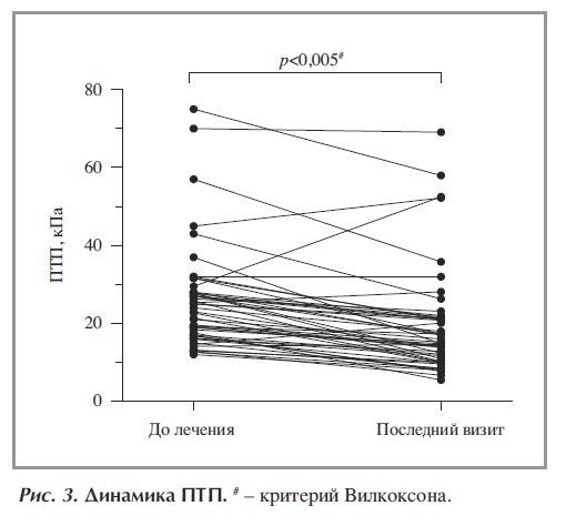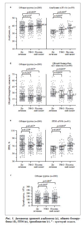 В ходе исследования количество тромбоцитов повысилось с 95,5·109/л до 112·109/л (p<0,005; рис. 1, г). У 31 (65%) и 2 (4,7%) из 47 больных отмечено купирование и уменьшение выраженности асцита, соответственно (p<0,005). Исчезновение и уменьшение выраженности ВРВП отмечено у 6 (7,6%) и 20 (17%) из 118 больных (p=0,007), соответственно. У 15 (45,4%) из 33 больных отмечено купирование печеночной энцефалопатии (p=0,008).