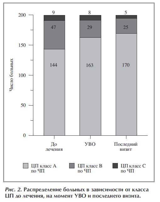 К концу наблюдения доля пациентов с ЦП класса А по ЧП увеличилась с 72% (144/200) до 85% (170/200), с ЦП класса В по ЧП уменьшилась с 23,5% (47/200) до 12,5% (25/200), с ЦП класса С по ЧП – с 4,5% (9/200) до 2,5% (5/200; рис. 2).