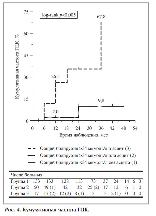 С помощью многофакторного регрессионного анализа Кокса установлено, что исходный уровень общего билирубина ≥34 мкмоль/л и асцит независимо ассоциируются с более высоким риском развития ГЦК (табл. 3). На основании полученных результатов больные разделены на три группы: 1-я группа – больные без факторов риска ГЦК, 2-я группа – больные с одним фактором риска ГЦК, 3-я группа – больные с двумя факторами риска ГЦК. Анализ Каплана–Майера показал значительное увеличение кумулятивной частоты ГЦК у больных 3-й группы (до 26,5 и 67,8% через 12 и 36 мес после окончания ПВТ, соответственно; рис. 4).