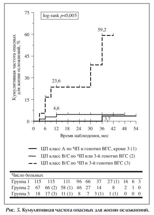 При проведении многофакторного регрессионного анализа Кокса установлено, что исходно декомпенсированный ЦП и 3-й генотип ВГС являются независимыми факторами риска развития опасных для жизни осложнений ЦП (табл. 4). При анализе Каплана–Майера кумулятивная частота развития опасных для жизни осложнений ЦП у больных с указанными факторами риска составила 23,6 и 59,2% через 12 и 36 мес после окончания ПВТ, соответственно (рис. 5).