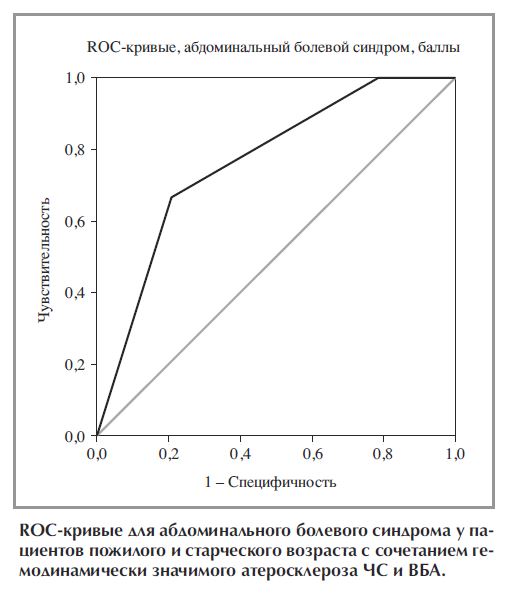 ROC-кривые для абдоминального болевого синдрома у пациентов пожилого и старческого возраста с сочетанием гемодинамически значимого атеросклероза ЧС и ВБА.