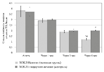 При межгрупповом сравнении статистически более значимыми были уменьшение одышки по шкале Borg через 3, 6 мес наблюдения (p=0,041 и p=0,001 соответственно) и снижение степени гнойности мокроты через 6 мес наблюдения (p<0,001) в группе ПМБЛ по сравнению с группой больных ХОБЛ, получавших стандартное лечение (рис. 1).