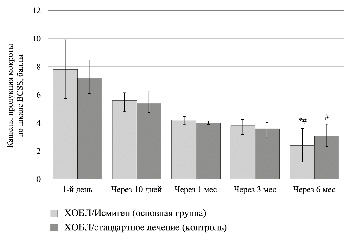 Рис. 2. Динамика показателя кашля и продукции мокроты по шкале BCSS у больных ХОБЛ на фоне проведенного лечения.