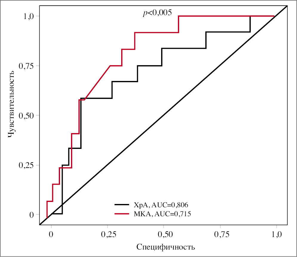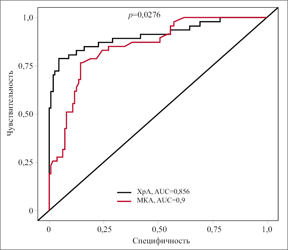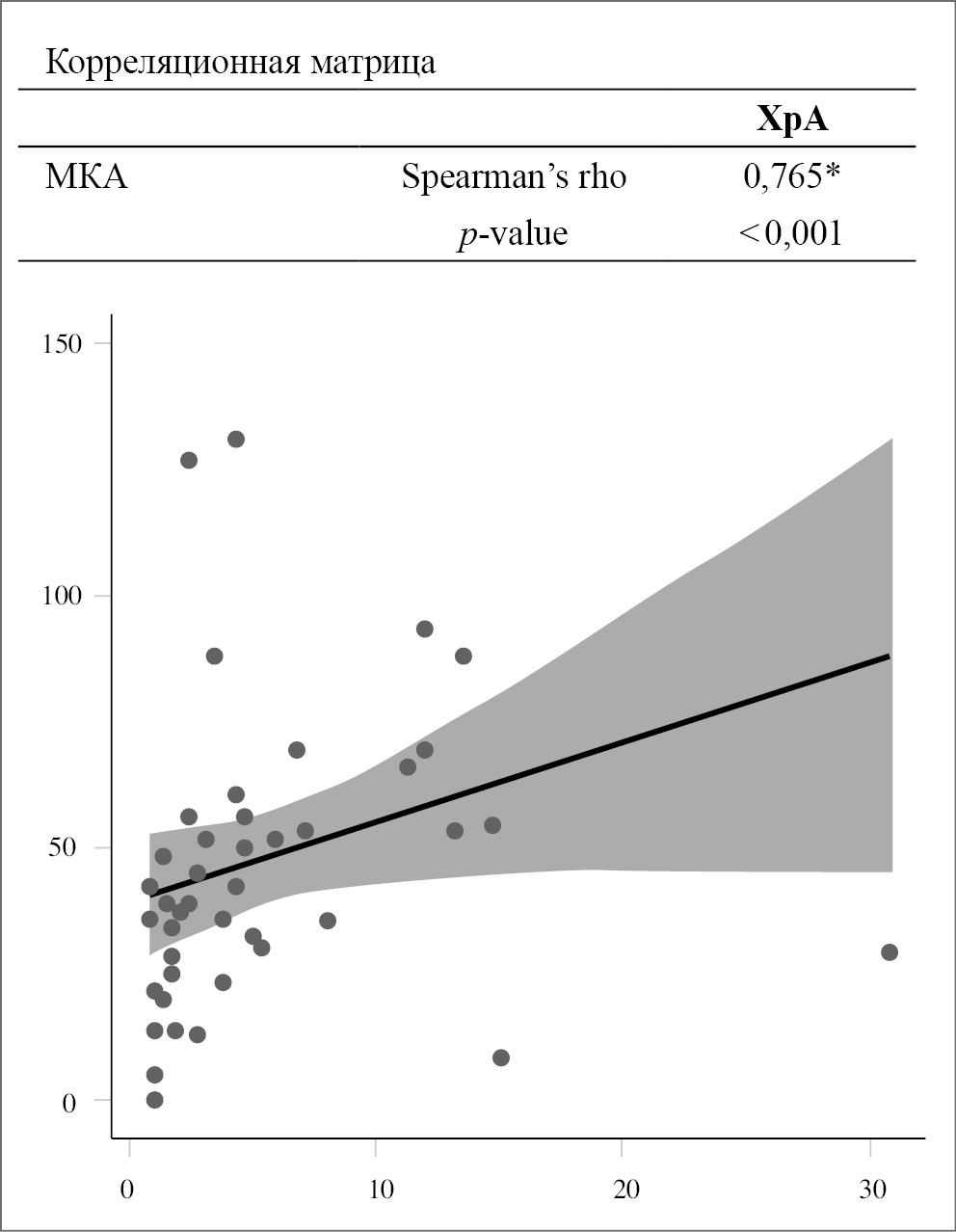 Кроме того, уровень ХрА среди пациентов 4-й группы оказался достоверно более высоким у пациентов с полученными результатам МКА в пределах «серой зоны» (р=0,000336) и составил 2,25 [0, 3; 9], в то время как у пациентов с нормальными показателями МКА он составил 0,87 [0, 1; 1, 7].