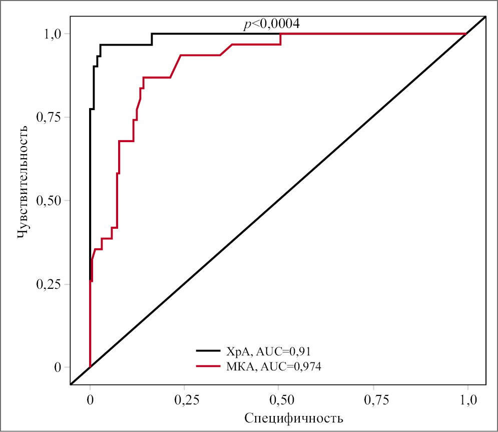 Статистическая обработка результатов осуществлялась с использованием программ Microsoft Excel XLSTAT, Statistica 10.0 (StatSoft Inc., США), применялся общепринятый метод статистического анализа – ROC-анализ, о статистической значимости различий качественных признаков судили по критерию Мак-Немара, а для оценки связи между параметрами применялся корреляционный анализ по Спирмену. Результаты представлены в виде медианы (Ме) с интерквартильным размахом [25-й; 75-й перцентили]. Различия считались статистически значимыми при p<0,05.