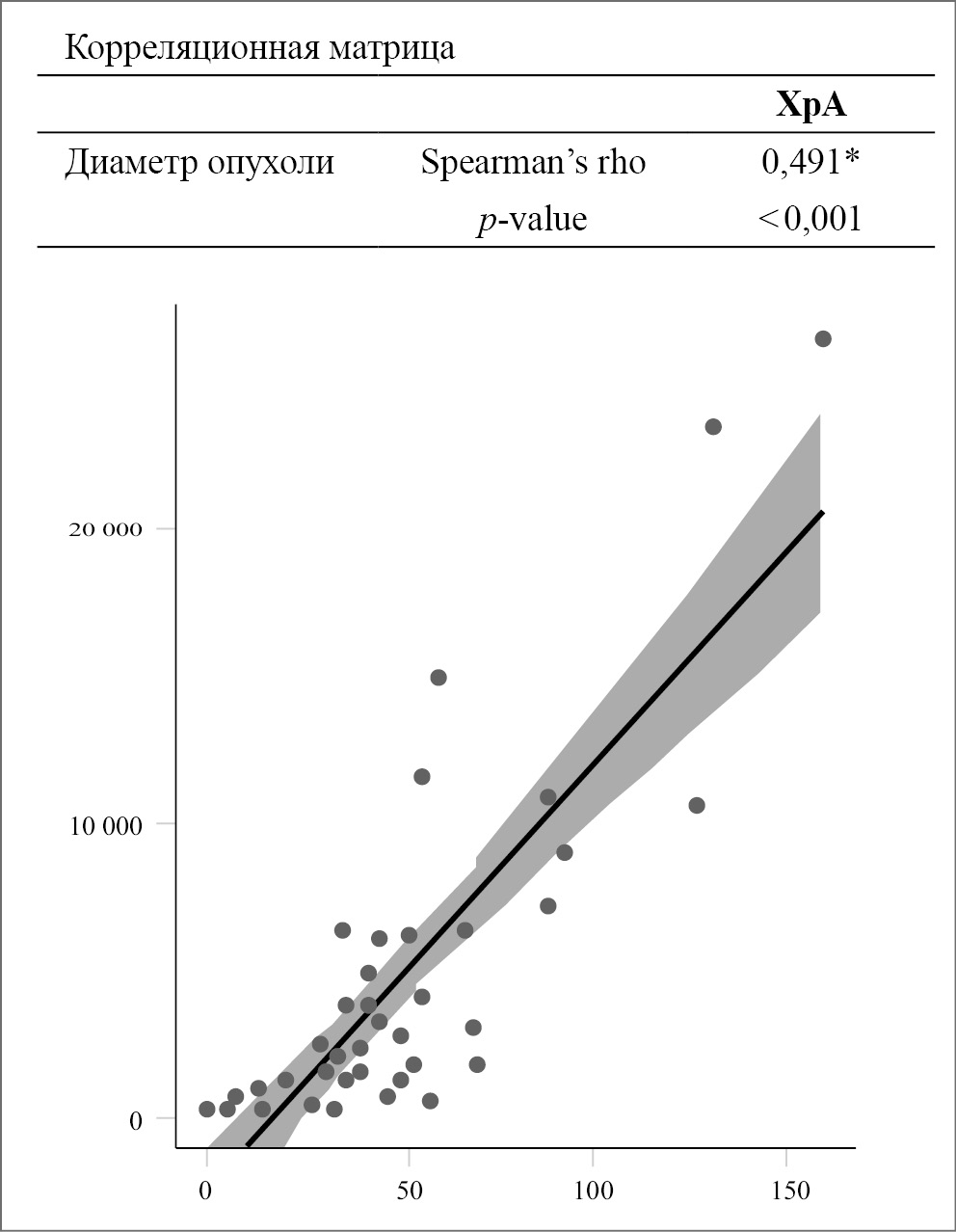 Рис. 5. Корреляция между размером опухоли и уровнем ХрА в во 2 и 3-й группах