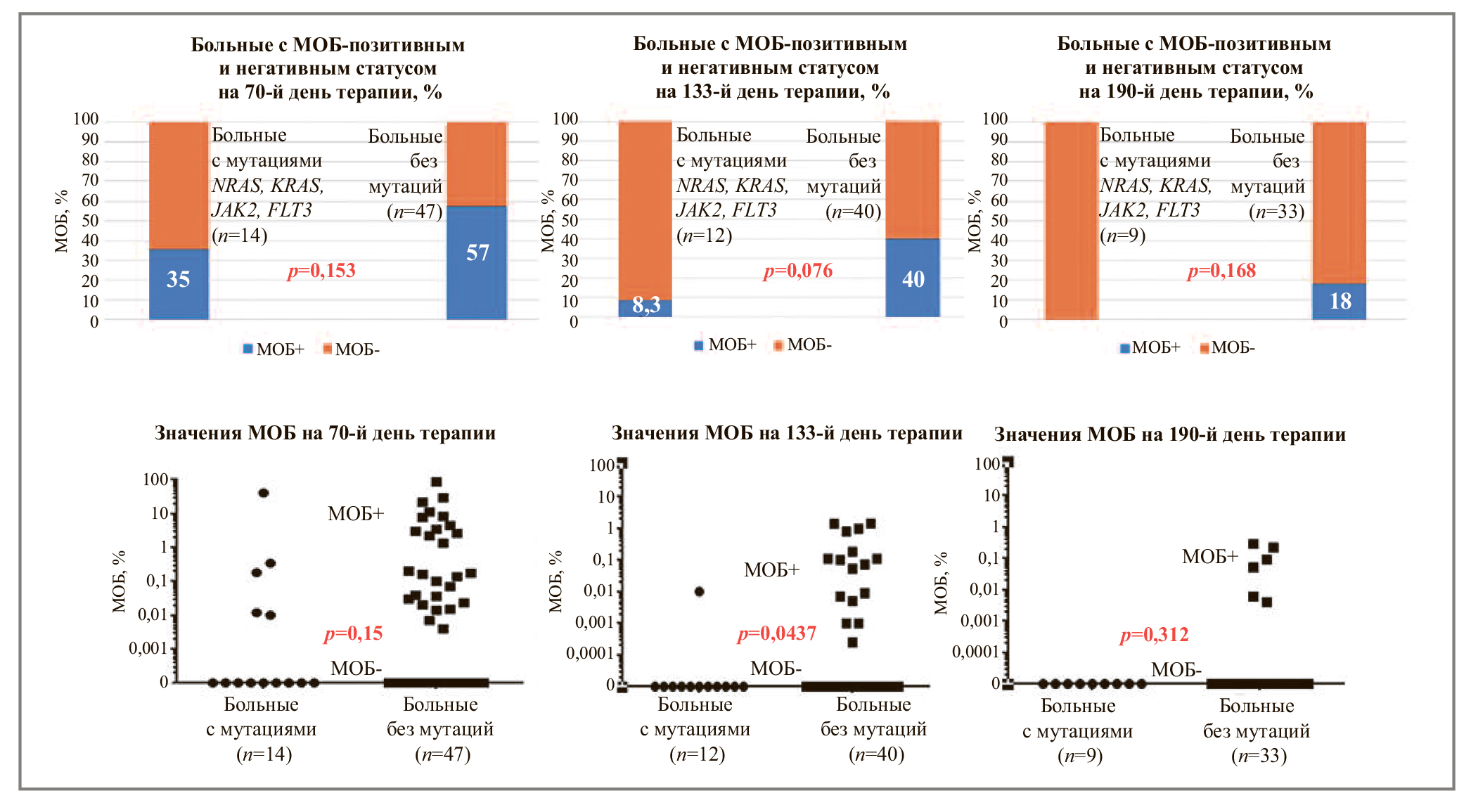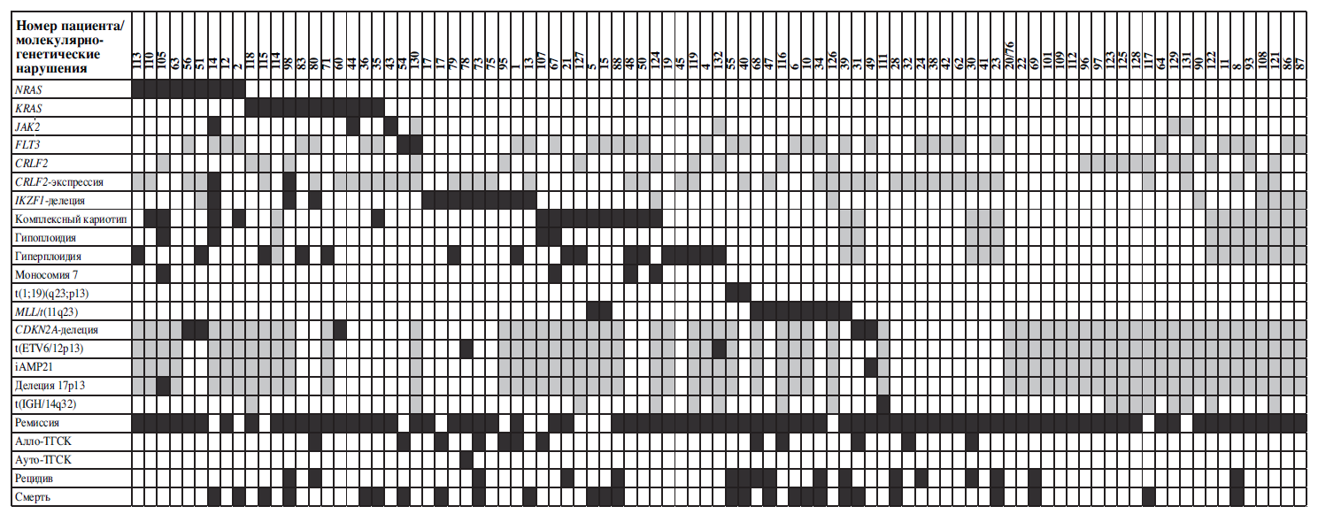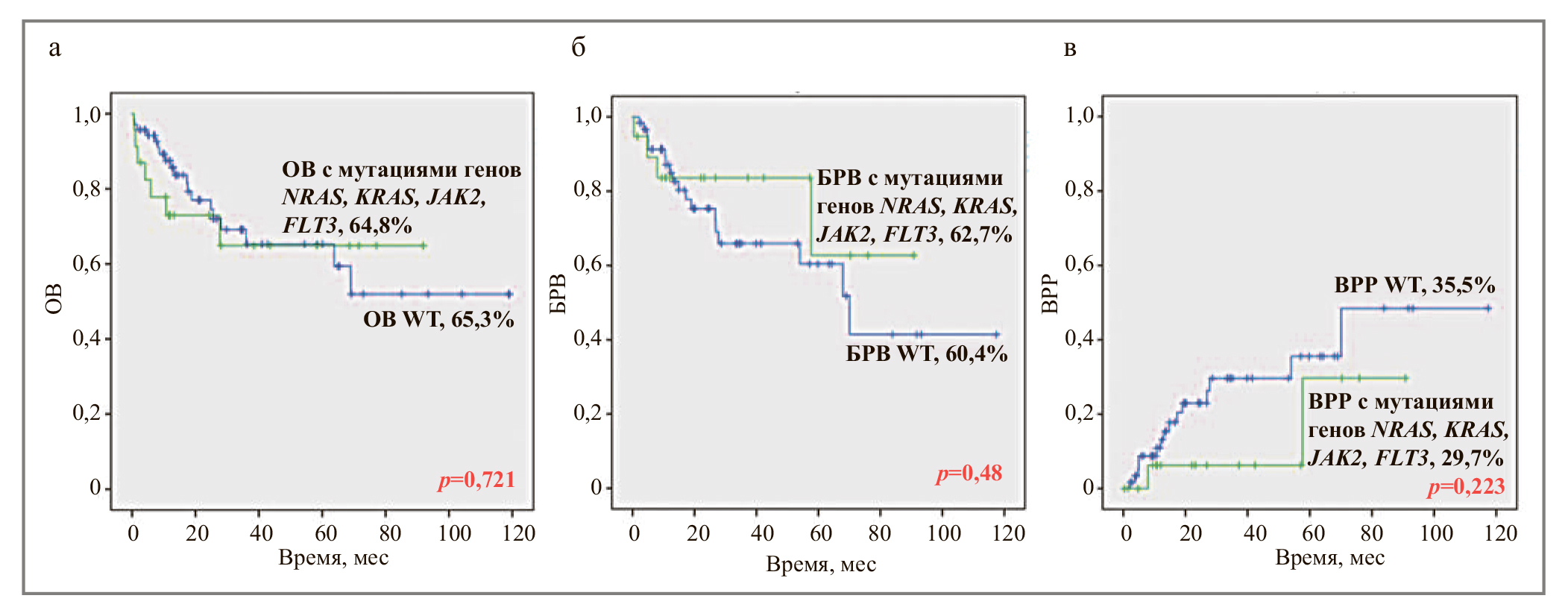 Заключение. Активирующие мутации генов NRAS, KRAS, FLT3, JAK2 не влияют на долгосрочные результаты терапии и скорость достижения негативного статуса минимальной остаточной болезни у больных BCR-ABL1-негативным В-ОЛЛ при применении протоколов российского многоцентрового исследования.