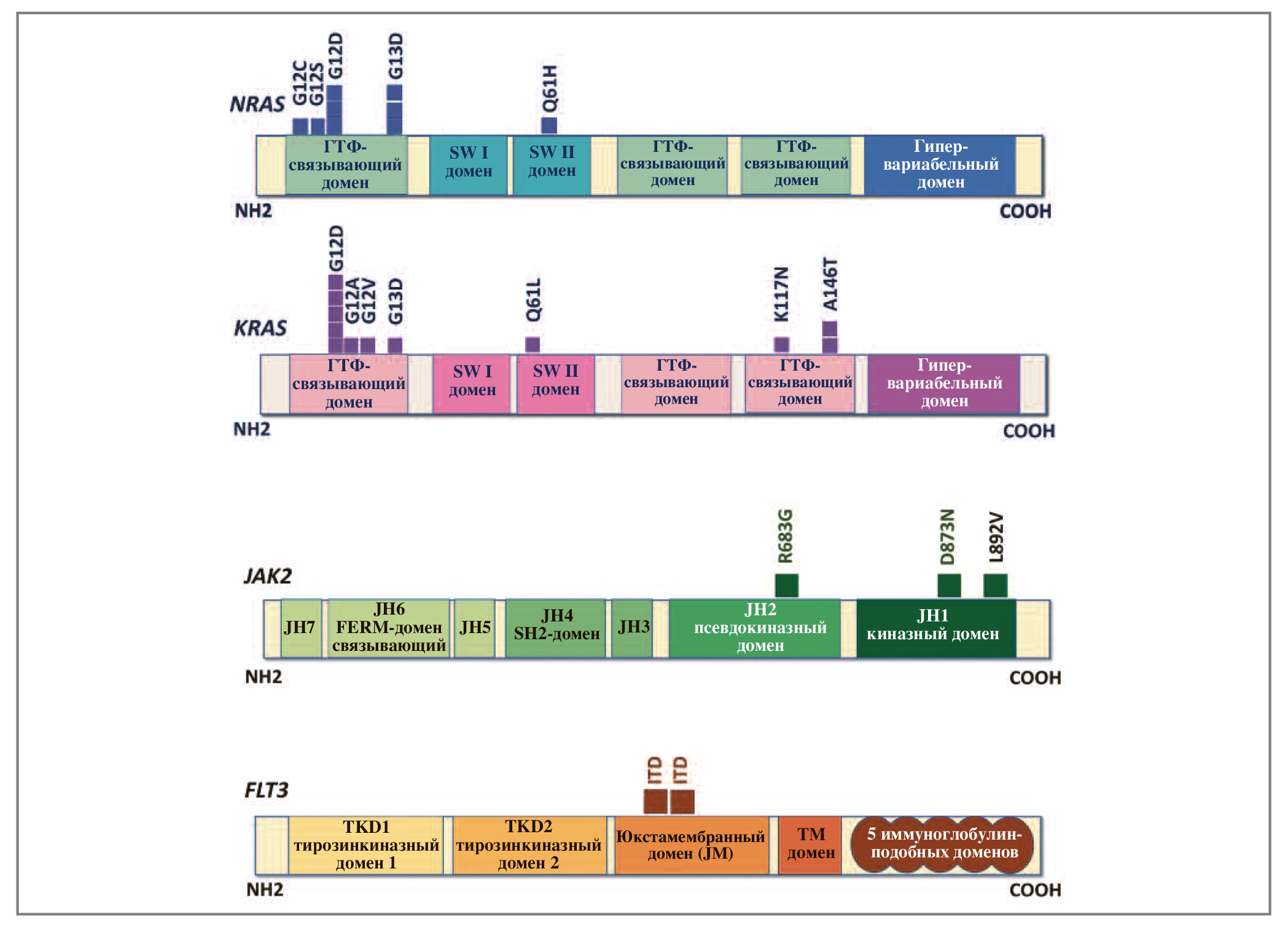 Нарушение регуляции сигнального каскада RAS/RAF/MEK/ERK часто сочетается с выявлением соматических активирующих мутаций в генах NRAS, KRAS, FLT3, PTPN11 и BRAF, определяющих активность этого сигнального пути.