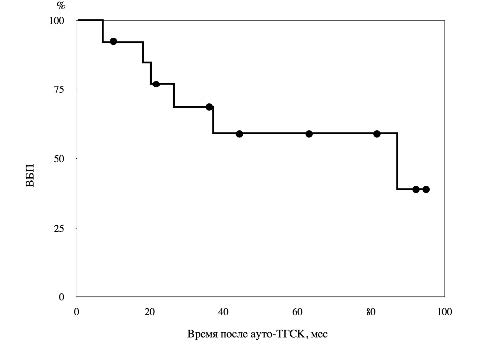 В проведенном нами исследовании летальность, связанная с трансплантацией, отсутствовала, хотя ранний пост­трансплантационный период сопровождался тяжелыми осложнениями. Показатели 5-летней ВБП (см. рисунок) и общей выживаемости высоки и составляют 59 и 93% соответственно при медиане наблюдения 53 мес. Отсутствие летальности, связанной с трансплантацией, может быть объяснено не только селекцией больных, но и улучшением диагностических методик и сопроводительной терапии, своевременной и слаженной работой медперсонала.
