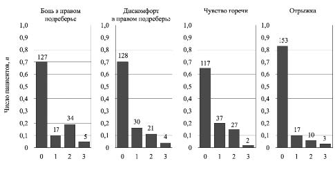 Чувство тяжести (дискомфорт) в правом подреберье | 55 | 30,1 |