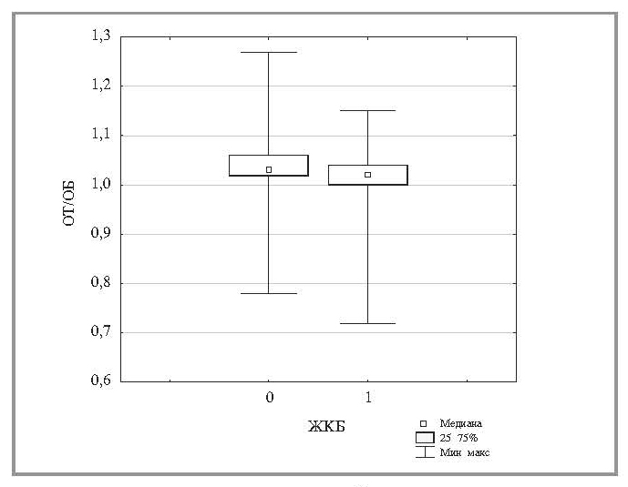 Рис. 2. Значение отношения ОТ/ОБ в группе пациентов, страдающих НАЖБП и ЖКБ (1), и группе сравнения (0).