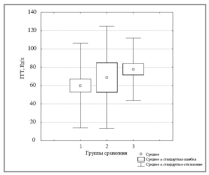 Рис. 3. Значение ГГТ в группах пациентов, страдающих НАЖБП и ЖКБ, перенесших ХЭ (3), страдающих НАЖБП и ЖКБ с сохраненным желчным пузырем (2) и группе сравнения (1).