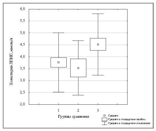 Рис. 4. Значение холестерина ЛПНП в группах пациентов, страдающих НАЖБП и ЖКБ перенесших ХЭ (3), страдающих НАЖБП и ЖКБ с сохраненным желчным пузырем (2) и группе сравнения (1).
