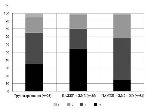 Установлена высокая распространенность ЖКБ среди пациентов с НАЖБП. Коморбидное течение ЖКБ и НАЖБП клинически характеризуется симптомами диспепсии (чувство горечи во рту, отрыжка) и общесоматическими жалобами (чувство слабости, повышенная утомляемость). У пациентов с ЖКБ и перенесенной ХЭ установлена высокая распространенность СД 2-го типа и ИБС. У лиц с сопутствующей ЖКБ и перенесенной ХЭ отмечаются более высокие показатели ЛПНП и ГГТ в сравнении с лицами без ЖКБ. Перенесенная ХЭ у пациентов, страдающих ЖКБ и НАЖБП, ассоциирована с формированием прогрессирующих стадий фиброза печени.