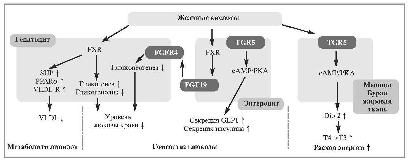 Примечание. Dio 2 – йодтиронин дейодиназа типа 2, T4 – тироксин, T3 – трийодтиронин, FGFR4 – рецептор 4 фактора роста фибробластов, PPARα – рецептор, активируемый пероксисомным пролифератором, SHP – малый гетеродимерный партнер, VLDL – холестерин ЛПНП, VLDL-R – рецепторы к холестерину ЛПНП, TGR5 – мембранный рецептор желчных кислот, cAMP/PKA – цАМФ/протеинкиназа А – зависимый путь, GLP1 – глюкагонподобный пептид 1.