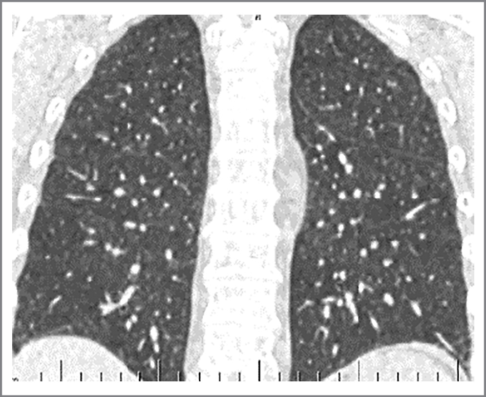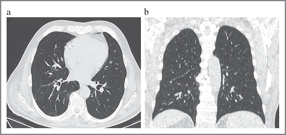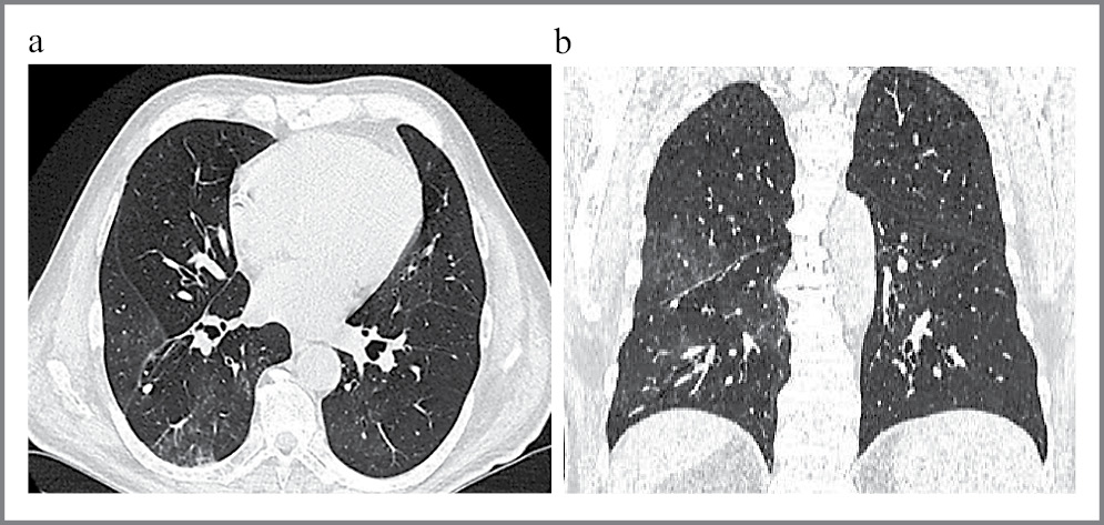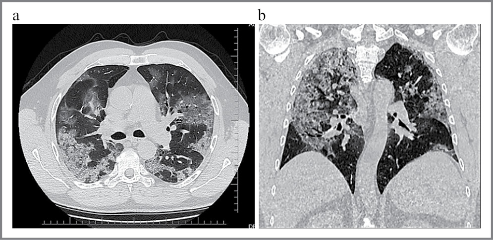 Рис. 2: а – аксиальная проекция; b – фронтальная проекция. КТ легких первого пациента до операции. Отмечаются множественные участки затемнения по типу «матового стекла».