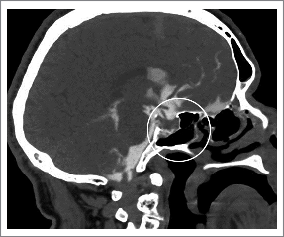 Перед операцией проведена КТ-цистернография, которая выявила наличие дефекта основания черепа: в области турецкого седла (рис. 3).