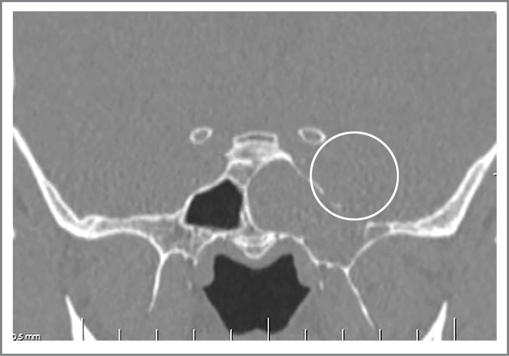 Рис. 5. КТ головного мозга, фронтальная проекция. Дефект основания черепа в области латерального кармана клиновидной пазухи слева.