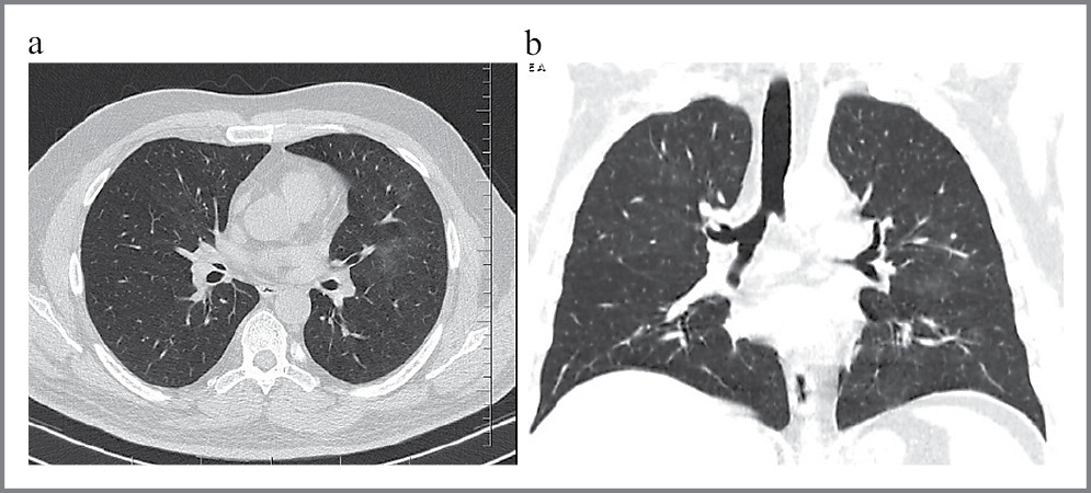 Рис. 6: a – аксиальная проекция; b – фронтальная проекция КТ органов грудной клетки перед операцией. Отмечаются множественные участки затемнения в левом легком по типу «матового стекла».