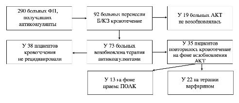 Материалы и методы. Исследование представляет собой анализ когорты больных ФП высокого тромботического риска с абсолютными показаниями к назначению антикоагулянтрой терапии (АКТ). В исследование включены 290 пациентов с ФП (130 женщин и 160 мужчин) в возрасте от 32 до 85 лет (средний возраст составил 65,18±8,89 года). За время наблюдения у 92 пациентов развились ГО, у 73 из них возобновлена АКТ. У 35 из 73 больных, возобновивших АКТ, развился рецидив большого/клинически значимого кровотечения.