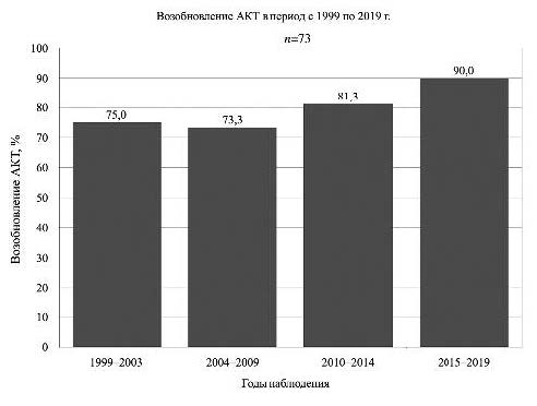 Рис. 2. Динамика возобновления АКТ после Б/КЗ кровотечения у больных ФП (по результатам 20-летнего проспективного наблюдения).