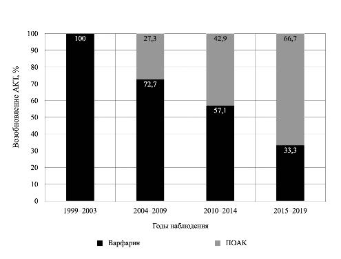 Частота возобновления АКТ после первого эпизода Б/КЗ кровотечения увеличивалась с течением времени с 75% в период 1999–2003 гг. до 90% в период 2015–2019 гг. Рост частоты возобновления АКТ после эпизода кровотечения связан с появлением на рынке нашей страны прямых оральных антикоагулянтов (ПОАК). К 2015–2019 гг. число больных, которым после развития ГО продолжена терапия варфарином, снизилось на 2/3, а соотношение АВК/ПОАК среди возобновивших прием антикоагулянтов в период 2015–2019 гг. составило 1:2 (рис. 3).