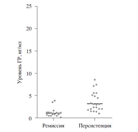 Рис. 2. Уровень ГР через 24 ч после операции в группах ремиссии и персистенции акромегалии.
