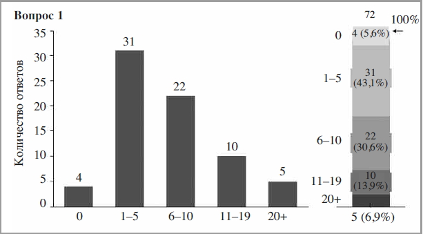 Рис. 2. Ответы на вопрос «Сколько больных за последний месяц вы обследовали на гепатит С, назначая тест на антитела к вирусу гепатита С?»