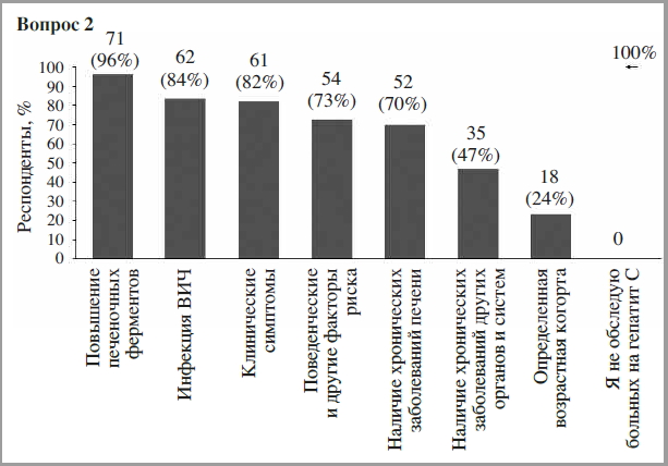 Всего на вопрос о критериях для обследования пациентов на ВГС (вопрос 2, рис. 3) ответили 74 опрошенных. Обращает на себя внимание, что подавляющее большинство врачей назначат обследование на ВГС при повышении печеночных трансаминаз, но только 7 из 10 – при наличии хронического заболевания печени. И даже при наличии клинической симптоматики лишь 82% респондентов будут обследовать на ВГС. Важно отметить, что результаты научных исследований свидетельствуют об отсутствии корреляции между повышением печеночных трансаминаз и выраженностью органических изменений печени [11]. Так, нормальный уровень аланинаминотрансферазы наблюдался [14] у 23% пациентов без фиброза, 26% – со стадией F1, у 39% – со стадией F2, а также у 6% – со стадией F3 и 6% – с циррозом. В то же время повышенный уровень аланинаминотрансферазы диагностирован [14] у 16% пациентов без фиброза, у 20% пациентов со стадией F1 [15]. Тем не менее повышение печеночных трансаминаз, наличие клинической симптоматики, а также хронической патологии печени являются показаниями для обследования на ВГС [9].
