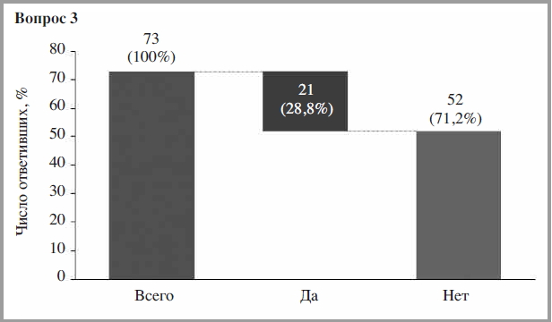 Знания вопросов верификации диагноза ВГС оценены в двух последовательных вопросах (вопросы 3, 4, рис. 4, 5). Результаты продемонстрировали, что около 1/3 врачей считают обнаружение антител к ВГС достаточным для постановки диагноза ВГС (28,8%; n=21), что выявления антител к ВГС недостаточно для постановки диагноза ХГС, – 71% (n=52) опрошенных.