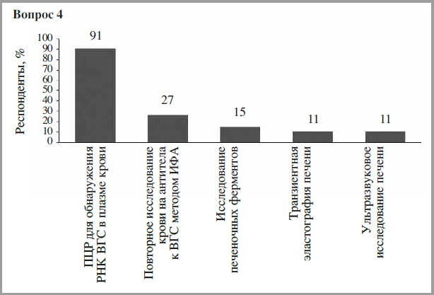 Вопрос 4 о дополнительных, подтверждающих диагноз ХГС (см. рис. 5) исследованиях подразумевал множественный выбор (число ответивших – 75). Абсолютное большинство (91%; n=68) верно отметили, что подтверждающим диагноз методом является полимеразная цепная реакция (ПЦР) для обнаружения РНК ВГС в плазме крови. Тем не менее 27% (n=20) респондентов отметили, что необходимо повторное исследование крови на антитела к ВГС методом иммуноферментного анализа (ИФА), 15% (n=11) – исследование печеночных ферментов, и по 11% (n=8) выбрали транзиентную эластометрию печени и ультразвуковое исследование печени. Однако ни один из данных методов, кроме ПЦР для обнаружения РНК ВГС, не позволяет верифицировать диагноз ВГС. Согласно современным клиническим рекомендациям после обнаружения антител к вирусу необходимо проведение подтверждающего теста – исследование методом ПЦР на РНК ВГС [11].