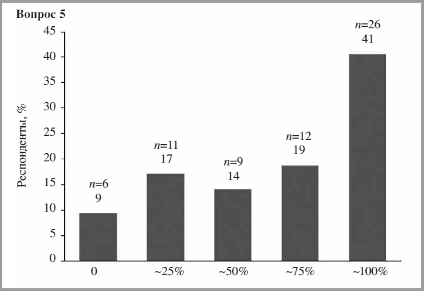 Рис. 6. Ответы на вопрос «Какая доля выявленных вами больных с ХГС находится под наблюдением врача-инфекциониста КИЗ или (в случае его отсутствия) направлена вами на консультацию в Гепатологичекий центр Клиники ФГБОУ ВО ЮУГМУ?»