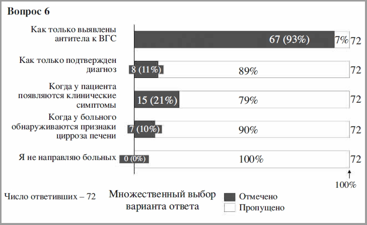 На вопрос 6 («Когда вы обычно направляете больных с гепатитом С к врачу-инфекционисту?») ответили 72 врача (рис. 7). Вопрос подразумевал выбор нескольких вариантов ответа. Наиболее значимым показанием для направления к инфекционисту подавляющее большинство врачей посчитали обнаружение антител к ВГС. Такой ответ согласуется с нормативно-правовой базой и особенностями организации обследования в амбулаторных медицинских организациях, когда они не имеют возможности самостоятельно исследовать ПЦР РНК или назначить ПЦР РНК может только инфекционист. Непонятно для авторов, по какой причине только каждый 10-й врач направит к инфекционисту при подтверждении диагноза ВГС-инфекции. Одной из причин может быть недостаточная осведомленность об изменении парадигмы лечения ХГС в последние годы и возможности его излечения более чем в 95% случаев, что подчеркивает необходимость проведения широкой информационной кампании среди медицинских работников на всех уровнях.