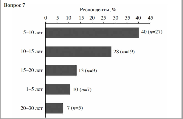Рис. 8. Ответы на вопрос «Какова в среднем длительность заболевания от момента заражения до начала формирования цирроза печени?»