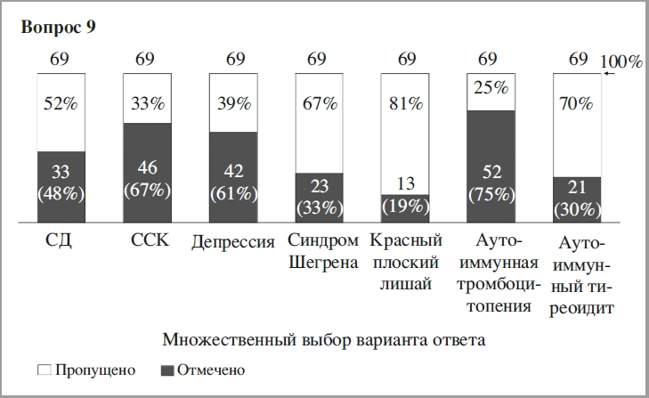 На вопрос 9 о неонкологических внепеченочных проявлениях ХГС ответили 69 врачей. Вопрос также подразумевал возможность множественного выбора (рис. 10). Наиболее часто выбрана связь с аутоиммунной тромбоцитопенией (риск развития которой увеличивается в 2 раза в сравнении с общей популяцией), несколько реже с ССК и депрессией. Согласно современным данным [8] ведущим внепеченочным синдромом является ССК: у 50–70% больных с ВГС-инфекцией в сыворотке крови наблюдают повышенные уровни криоглобулинов, тогда как ССК с клиническими проявлениями развивается у 15%. Депрессия встречается у пациентов с ВГС-инфекцией в 1,5–4 раза чаще, чем в общей популяции. Кроме того, наряду с ней при ВГС-инфекции наблюдаются утомляемость, когнитивные и другие нейропсихические нарушения [26].