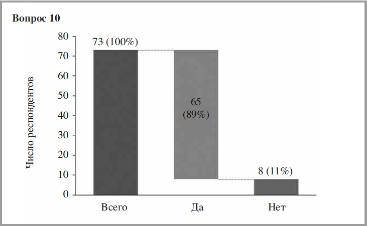 На вопрос 10 о возможности излечения гепатита С ответили 73 человека (рис. 11). Большая часть из них (89%; n=65) из них считают, что гепатит С излечим. Несколько респондентов при ответе на данный вопрос пометили в комментариях, что ответ зависит от того, есть ли у пациента цирроз печени. Однако современные данные свидетельствуют о том, что частота достижения устойчивого вирусологического ответа у пациентов с компенсированным заболеванием печени одинакова. И, хотя декомпенсация цирроза снижает вероятность эрадикации вируса, тем не менее при лечении современными безинтерфероновыми режимами частота устойчивого вирусологического ответа высока [11].