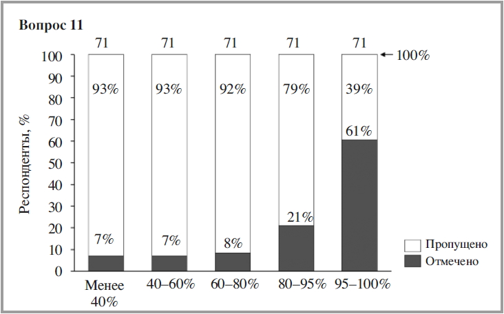 Эффективность современных схем терапии оценил 71 врач (вопрос 11, рис. 12). При этом несколько человек отметили несколько вариантов ответа на этот вопрос, поэтому сумма ответов составила 104%. Шесть из 10 (61%; n=43) респондентов ответили, что эффективность терапии составляет 95–100%, что соответствует данным клинических исследований и реальной клинической практики для всех без-ИФН-режимов, зарегистрированных в России [11]. Еще 21% (n=15) оценили эффективность существующих схем в 80–95%. Около 1/2 респондентов считают, что эффективность схем ПВТ<60%. Неверные представления врачей об эффективности ПВТ могут быть препятствием назначения своевременной и потенциально высокоэффективной терапии.