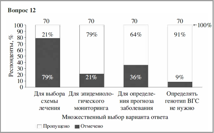 На вопрос 12 о генотипе ВГС ответили 70 человек. Данный вопрос подразумевал множественный выбор вариантов ответа (рис. 13). Значительная часть врачей (79%; n=55) считают, что определять генотип ВГС необходимо для выбора схемы лечения, 36% (n=25) – для определения прогноза заболевания, 21% (n=15) – для эпидемиологического мониторинга, 9% (n=6) опрошенных ответили, что определять генотип не нужно. В целом ответы на данный вопрос соответствовали ожиданиям. В настоящий момент существуют эффективные пангенотипные схемы терапии, которые позволяют лечить пациентов вне зависимости от генотипа ВГС, однако их применение в России может быть ограничено назначением преимущественно определенным категориям пациентов (по клиническим показаниям). Интересен тот факт, что ответ 9% врачей соответствует рекомендациям Всемирной организации здравоохранения, согласно которым использование современных пангенотипных схем позволяет проводить терапию только при наличии у пациента виремии. В нашей стране, согласно клиническим рекомендациям, генотипирование является обязательным, поскольку наряду с пангенотипными используются режимы, показанные для лечения только 1 и 4-го генотипов.