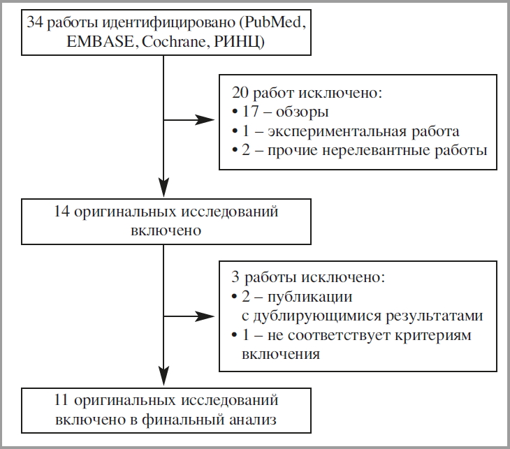 Поиск по электронным базам данных выявил 34 работы для последующего анализа. Из них 20 исследований исключено, так как они не являлись оригинальными работами (17 – обзоры; 1 – экспериментальное исследование; 2 – прочие нерелевантные работы). Отобранные 14 работ детально анализировались на соответствие критериям включения, после чего 3 исследования исключено (рис. 1). В итоге 11 оригинальных исследований включено в настоящий метаанализ (табл. 1) [19–29].
