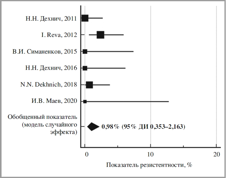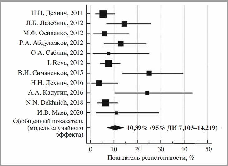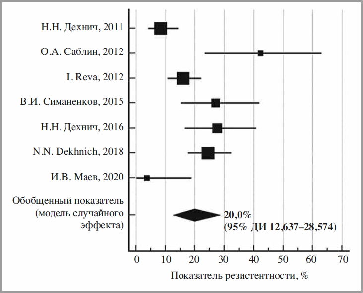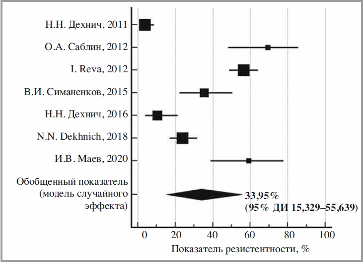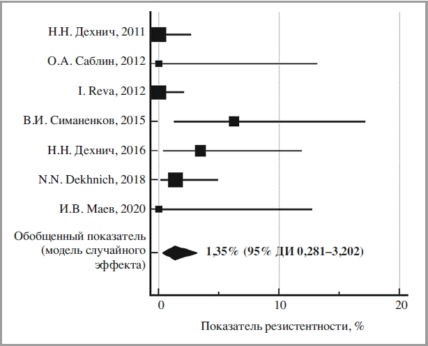 Methods. A search for studies were carried out in electronic databases MEDLINE/PubMed, EMBASE, Cochrane, Russian Science Citation Index. We analyzed the papers published over the past 10 years (2011 to 2020). In the final analysis, publications were selected from periodical peer-reviewed foreign and Russian publications, in which validated tests for assessing the microorganism resistance were used with detailed descriptive statistics, which allows the obtained data to be included in the meta-analysis.