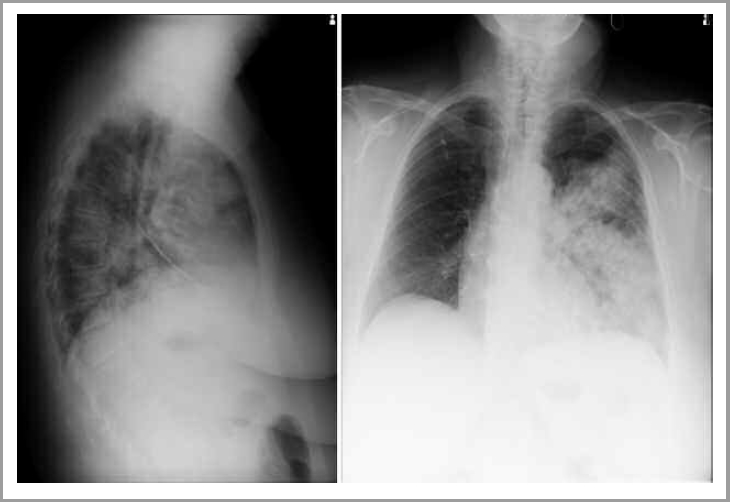 По данным ЭКГ – синусовая тахикардия до 140 уд/мин, депрессия сегмента ST в III, avF, отведениях V5–V6. На рентгенограммах органов грудной полости в двух проекциях (левая боковая) субтотально понижена воздушность левого легочного поля за счет фокусов массивной инфильтрации сливного характера без четких контуров в проекции S3, S6, S8–10, язычковых сегментов с реакцией косой междолевой плевры в виде ее утолщения, неоднородной структуры за счет участков просветления (рис. 1).