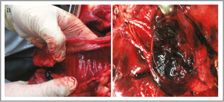 Рис. 2. а - слизистая оболочка трахеи и бронхов набухшая толстая, красновато-серого цвета, с множественными кровоизлияниями; б - левое легкое и нижняя доля правого легкого: мелкопористые, неравномерного розовато-красного цвета, со множеством сливающихся очагов темно-красного цвета, плотной консистенции, выбухающие на разрезе. С поверхности разреза стекает большое количество жидкости геморрагического характера.