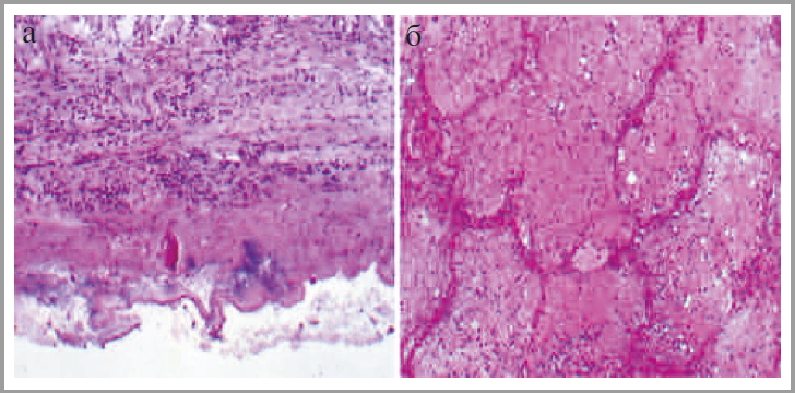 Рис. 3. а - гнойно-некротический трахеит: гнойный экссудат в стенке трахеи, некроз слизистого и подслизистого слоев, колонии S. ayreus в слизистом слое (окраска гемотоксилинэозином, *100); б - ткань легкого с полнокровными сосудами межальвеолярных перегородок, геморрагическим экссудатом в просвете альвеол (окраска гематоксилин-эозином, *100)