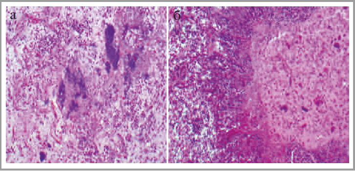 Рис. 4. а - гнойный экссудат в просвете альвеол, колонии S. aureus (окраска гкматооксицилин-эозином,*100); б - ткань легкого с очагом деструкции, колониями S.aureus, перифокальным гнойным воспалением (окраска гематооксицилин-эозином,*100)