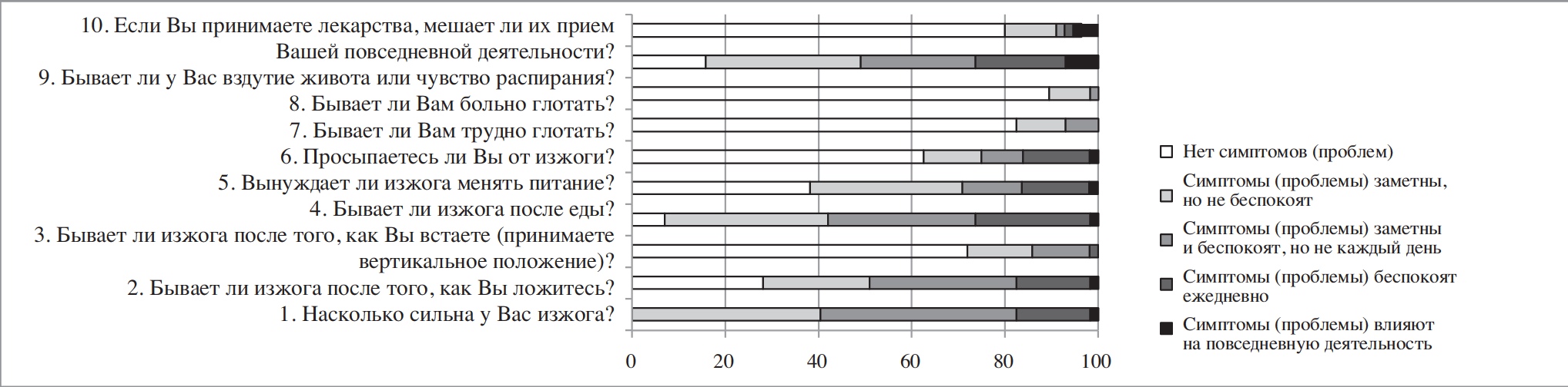 Распределение больных согласно показателям симптомов/проблем ГЭРБ по опроснику GERD-HRQL (в виде процентных долей от количества наблюдений) представлено на рис. 1.