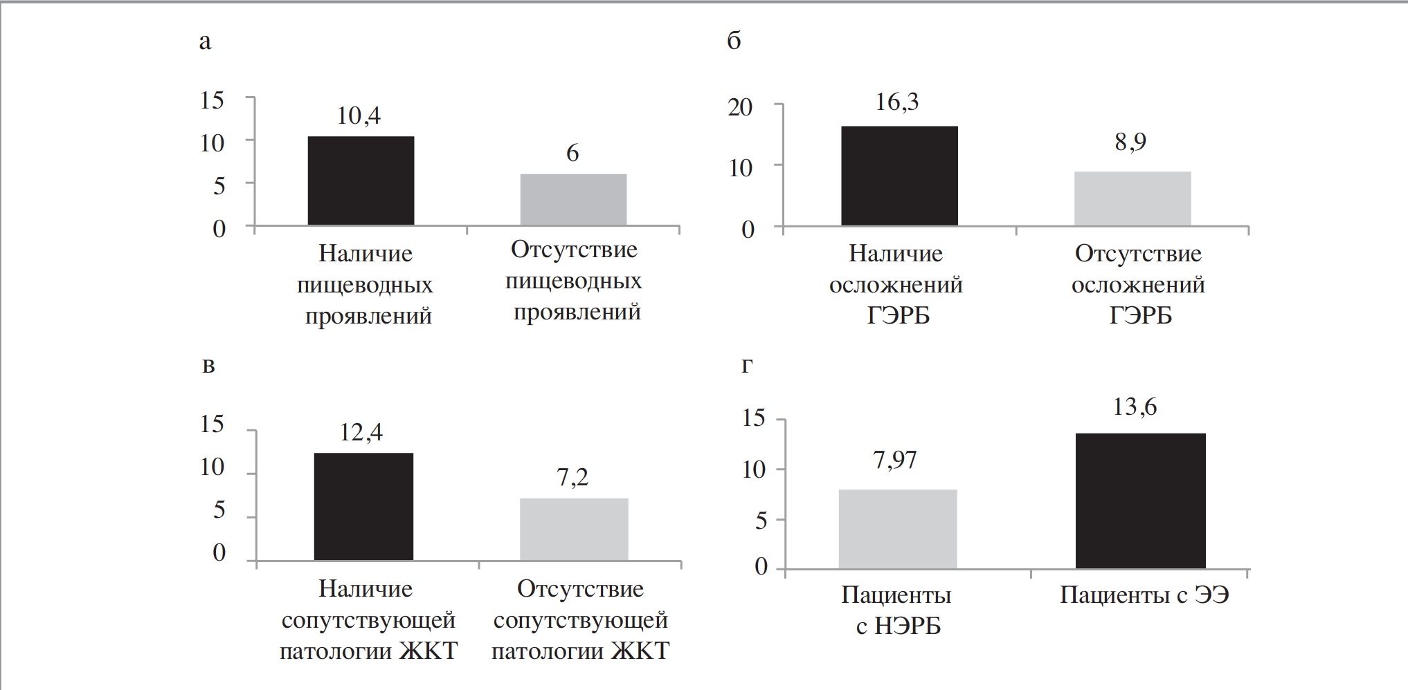 У пациентов с наличием пищеводных проявлений суммарный балл по GERD-HRQL статистически значимо выше, чем у пациентов с отсутствием пищеводных проявлений (10,4 против 6,0; t-критерий Стьюдента, p=0,048); у пациентов с наличием осложнений ГЭРБ суммарный балл по GERD-HRQL статистически значимо выше, чем у пациентов с отсутствием осложнений ГЭРБ (16,3 против 8,9; t-критерий Стьюдента, p=0,001); у пациентов, имеющих сопутствующую патологию верхних отделов ЖКТ, суммарный балл по GERD-HRQL статистически значимо выше, чем у пациентов, не имеющих сопутствующей патологии верхних отделов ЖКТ (12,4 против 7,2; t-критерий Стьюдента, p<0,001); у пациентов c НЭРБ суммарный балл по GERD-HRQL статистически значимо ниже, чем у пациентов с ЭЭ (7,97 против 13,6; t-критерий Стьюдента, p<0,001); рис. 2.