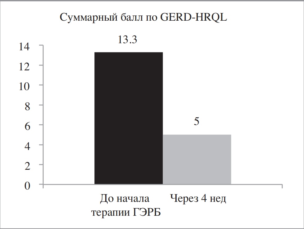 Для оценки чувствительности GERD-HRQL проводили анализ изменений суммарного балла по опроснику в процессе лечения в группе больных, заполнивших опросник до начала антирефлюксной терапии и через 1 мес после начала лечения.