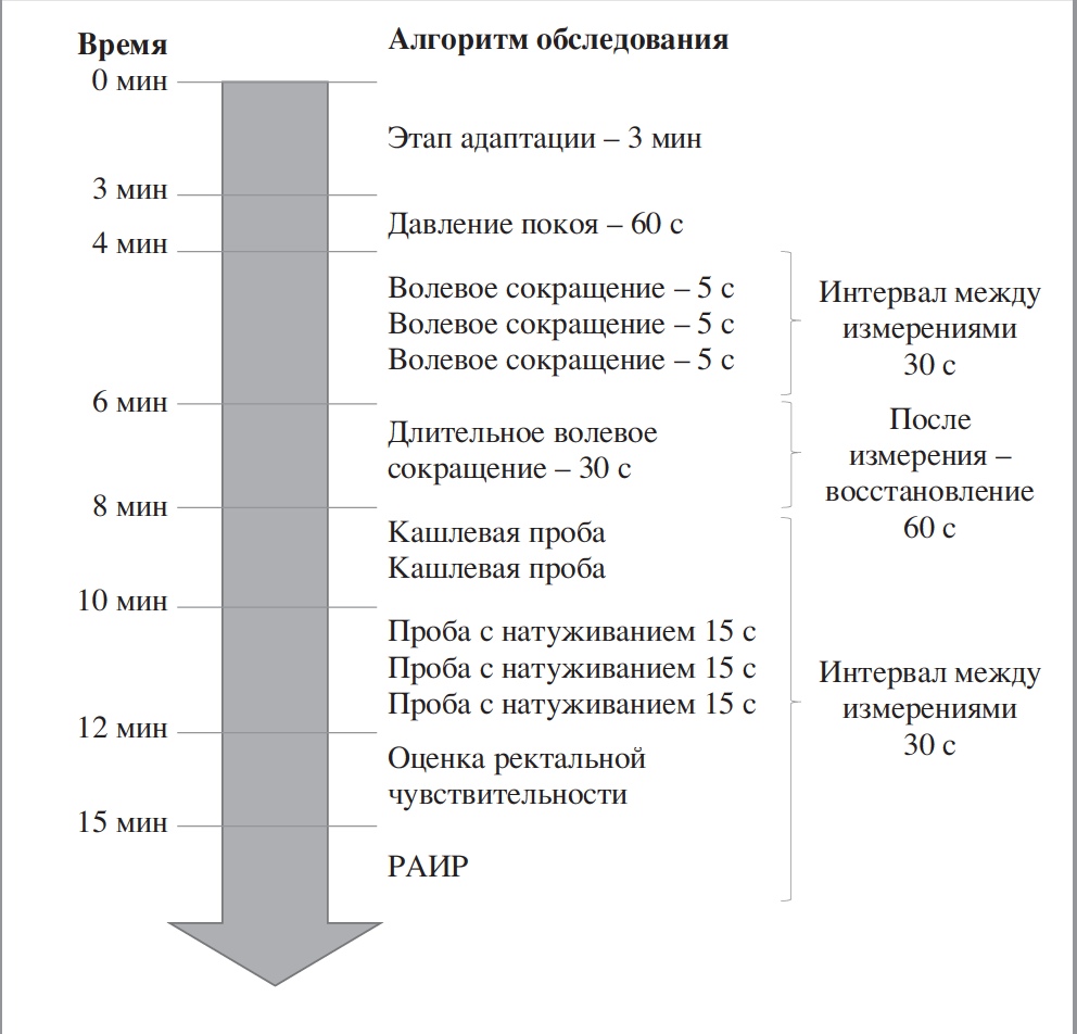 3. Figure: 2. Scheme of the examination of the patient using functional methods for assessing the anorectal zone. Note. The given timelines differ from the original ones (the total duration of the survey in the original document is 12 minutes), since the sum of the time intervals required for the individual stages of the survey is greater than the one given by the authors of the international consensus.