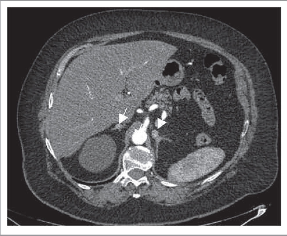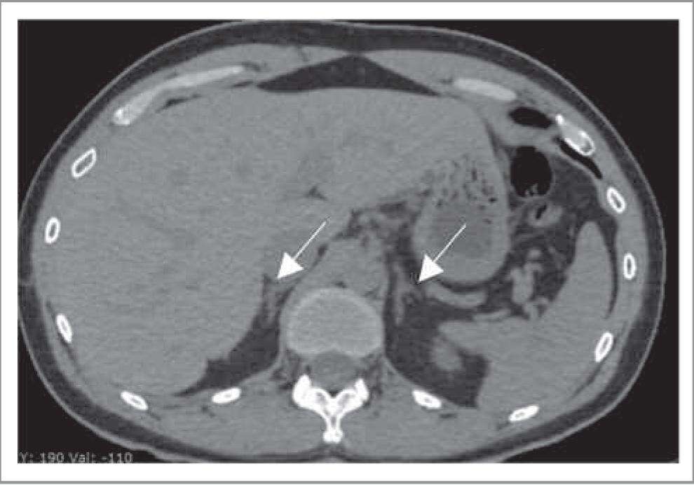 Рис. 1. КТ, НФ, аксиальная проекция. Нормальное изображение надпочечников. Правый надпочечник (тонкая стрелка), левый надпочечник (толстая стрелка).